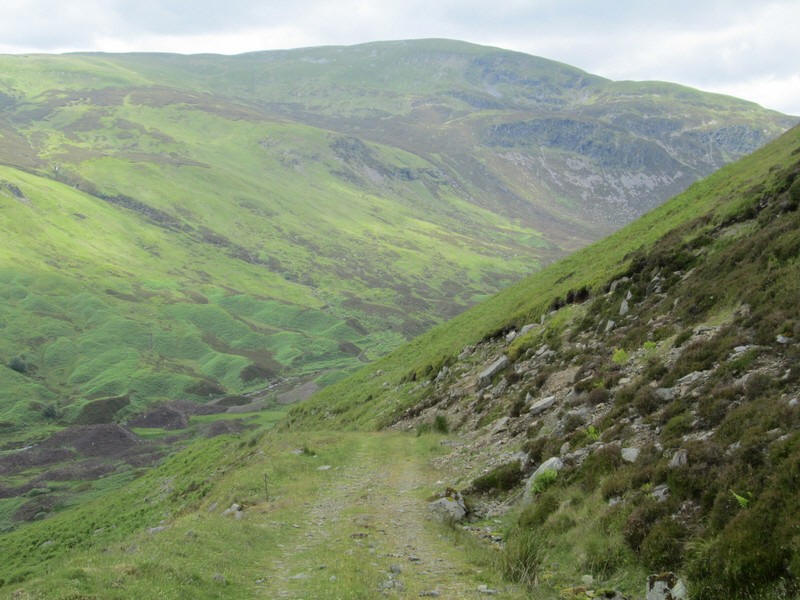 Descending the steep track down into Glen Turret Ben Chonzie is directly ahead.