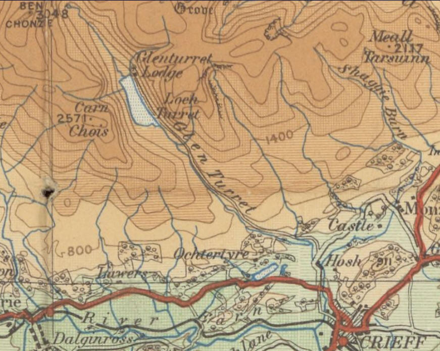 This 1923 quarter inch to the mile map shows the original loch complete with the Glenturret Lodge which has disappeared under the water of the reservoir.