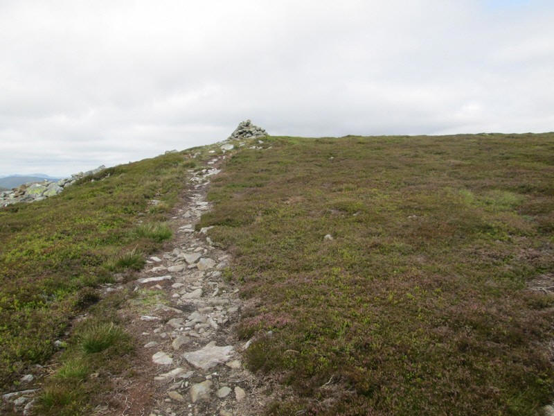 Across the grassy moorland one of the cairns on the summit comes into view as the now slightly fainter track heads in that direction.