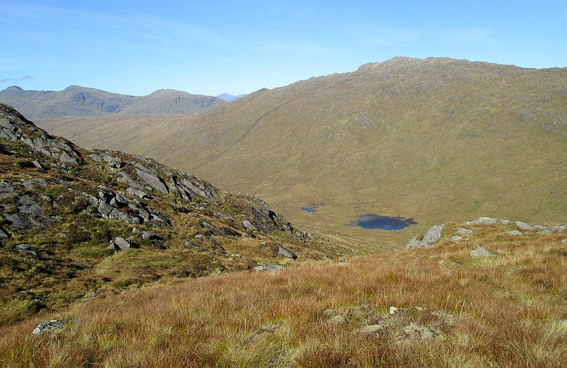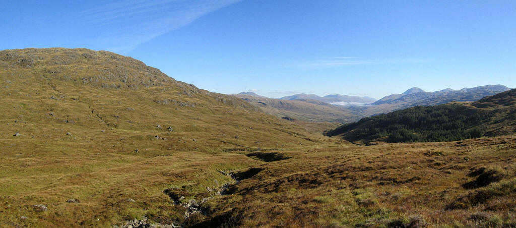 Over to the north in the Lairig Arhan there are several small lochans with the Corbett Meall an Fhudair above. To the left are the crags on the Munro Beinn Bhuide.