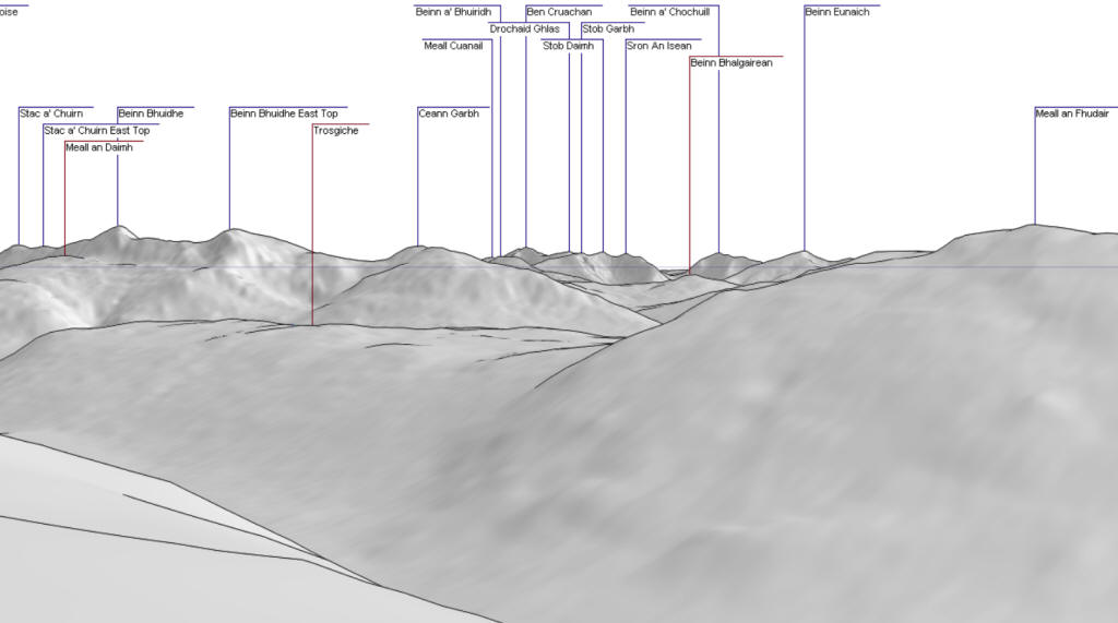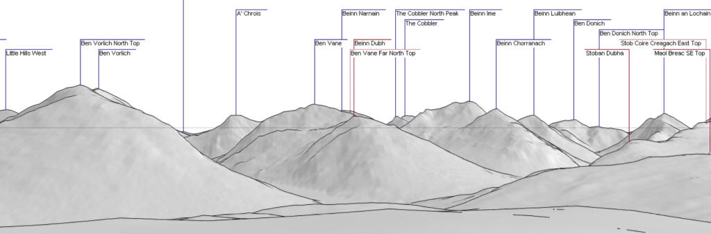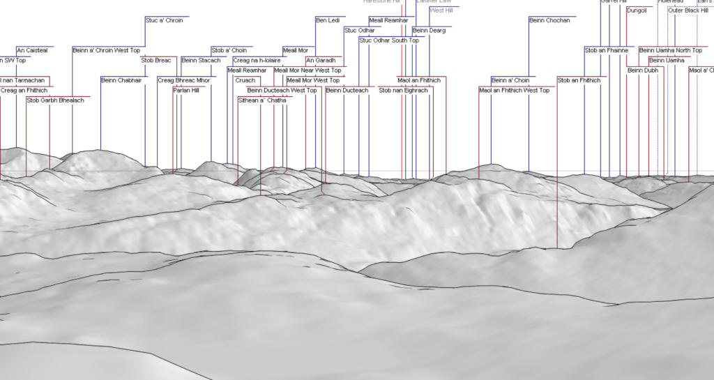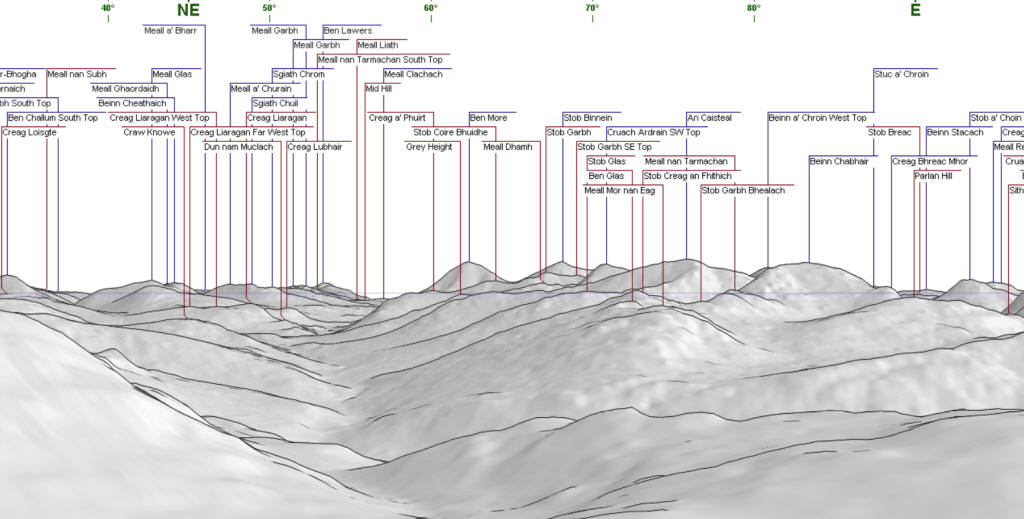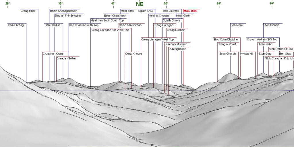 The panoramic diagrams and photos below show just how extensive the views from this hill are with only the hills directly North being blocked by the neighbouring Corbett Meall an Fhudair.
