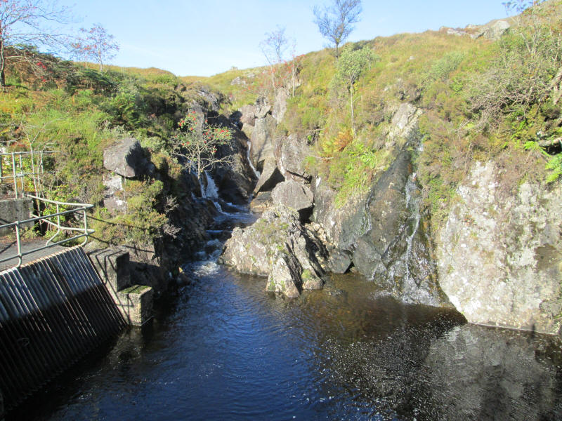 Behind the dam is a small pool where the rock was blasted away during construction of the hydro-electric scheme. On the left is the sluice gate which feeds water into the underground pipeline that takes water to the Loch Sloy dam.