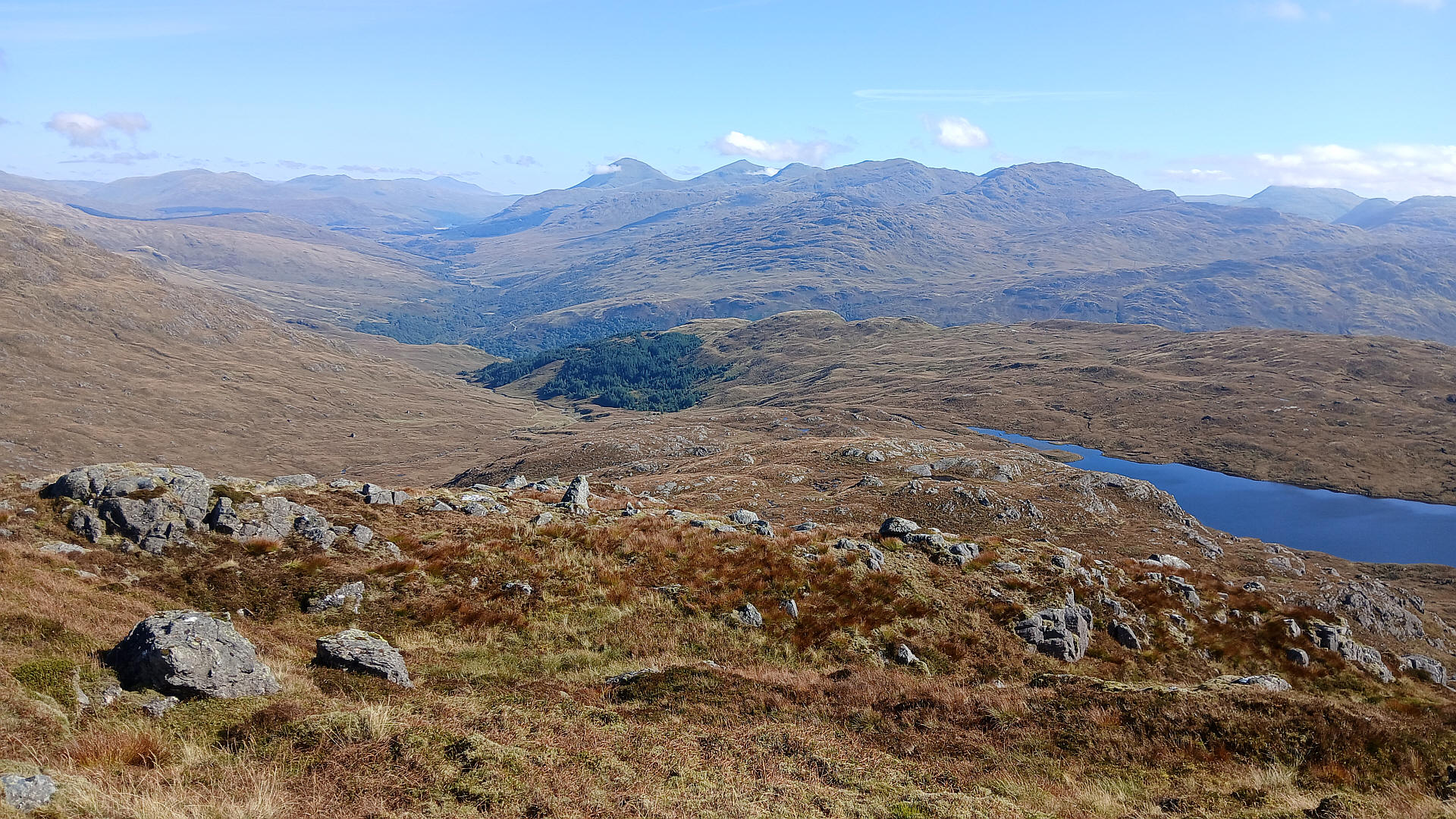 Looking north east numerous Munros can be seen, with Ben Challum on the left and the conical Ben More centre right. By comparing the panorama and photo Ben Lawers (42km away) can just be seen.