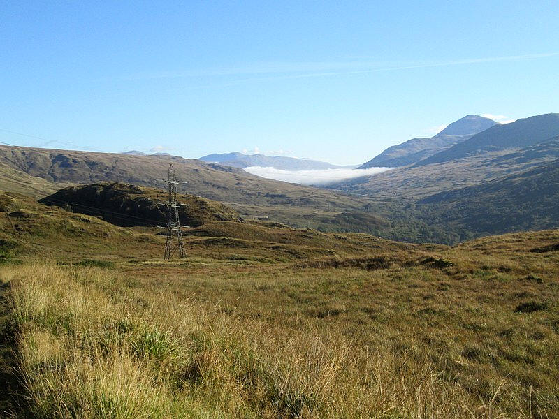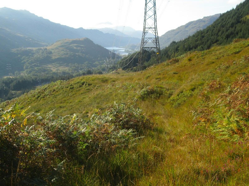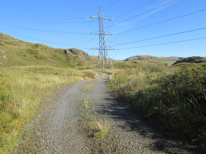 The first part of the day's walk starts along a track constructed whilst the pylons were erected for Sloy hydro scheme. It is now very overgrown, wet and at times difficult to follow but it avoids the need to walk on the dangerous A82 to reach the main hydro road that starts north of Inverarnan.