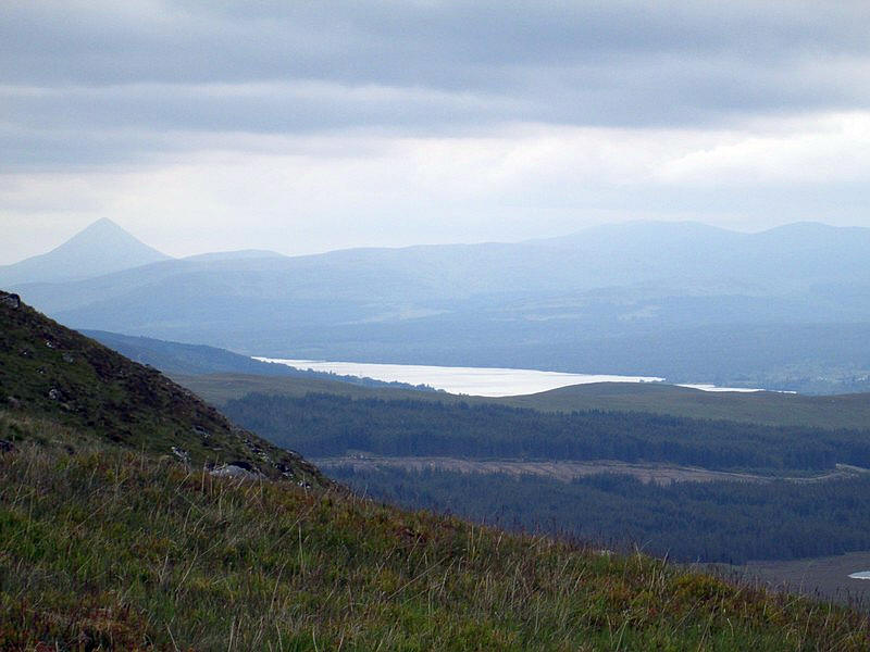 Looking east Loch Rannoch and the pyramid like Schiehallion can be seen.