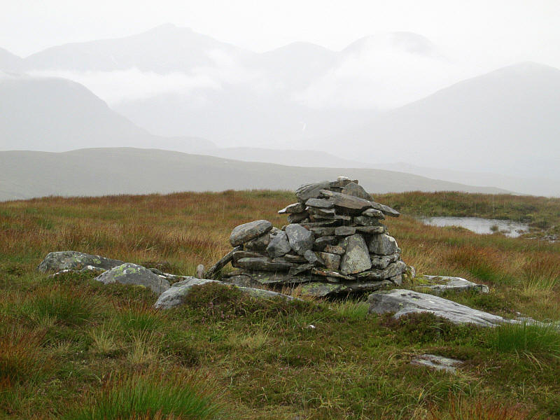 The summit cairn is in view with a small lochan close by.