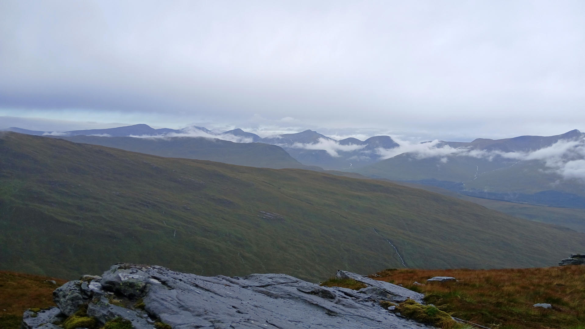 On the way down the hill back to the West Highland Way weather conditions slowly improved and, after it stopped raining, I used the camera on my mobile phone to get some panoramic photos of the surrounding hills.