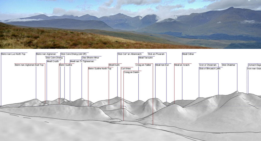 Looking North West are the isolated, and difficult to get to, Munros of Stob Coir' an Albannaich and Meall nan Eun