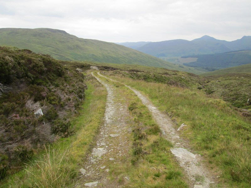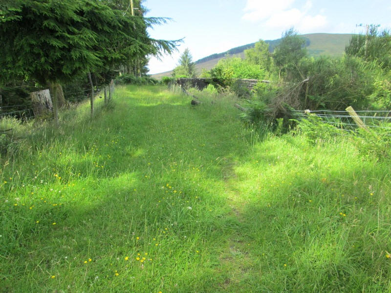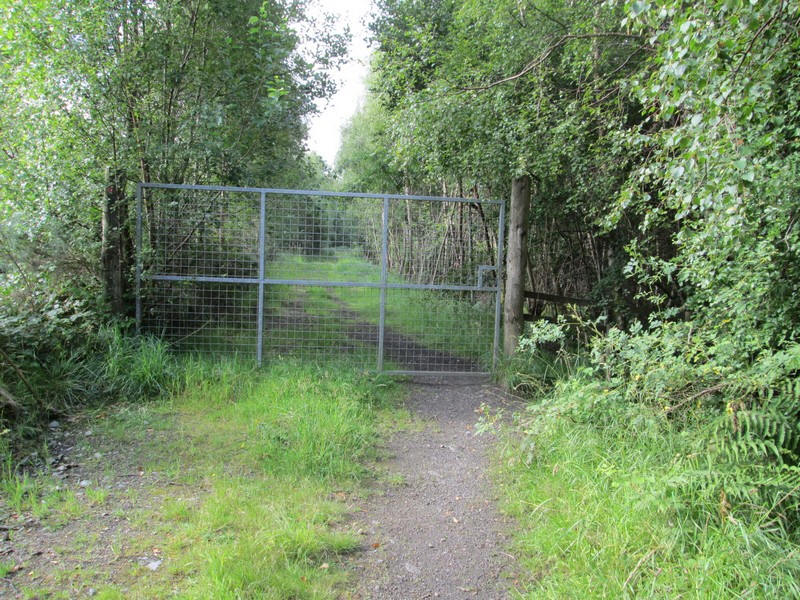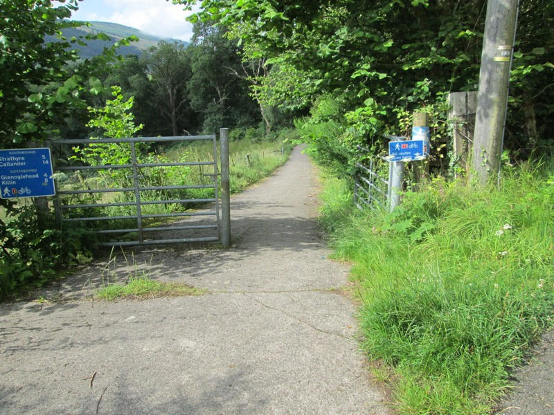 The cycle track now reaches the course of the Callander and Oban Railway and continues towards Killin through Glen Ogle. To get to the hills we now do a sharp left turn and go through this unlocked gate.