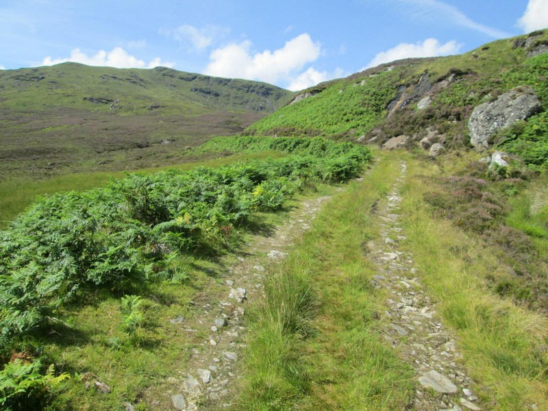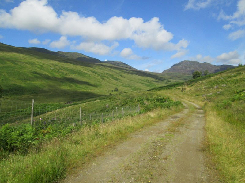 Once beyond the plantation Glen Kendrum opens up and the two hills at the head of the glen can be seen. On the right is Creag Mac Ranaich and on the left Meall an t-Seallaidh. By now the temperature had risen into the 20s Celsius and for most of the day it was shirt sleeves weather.