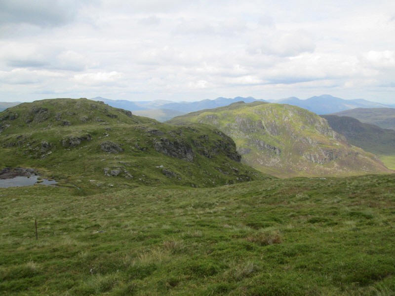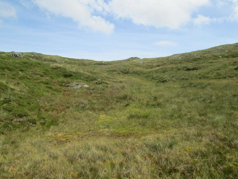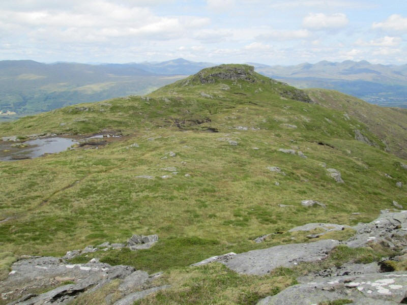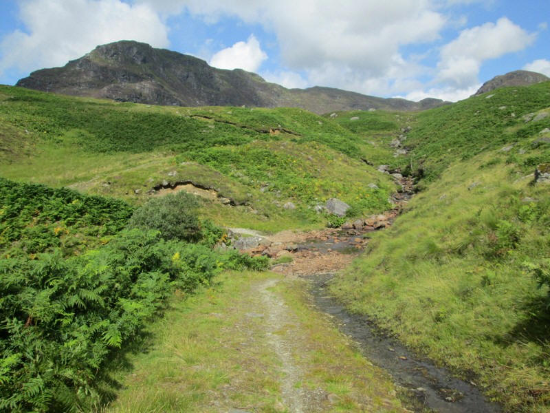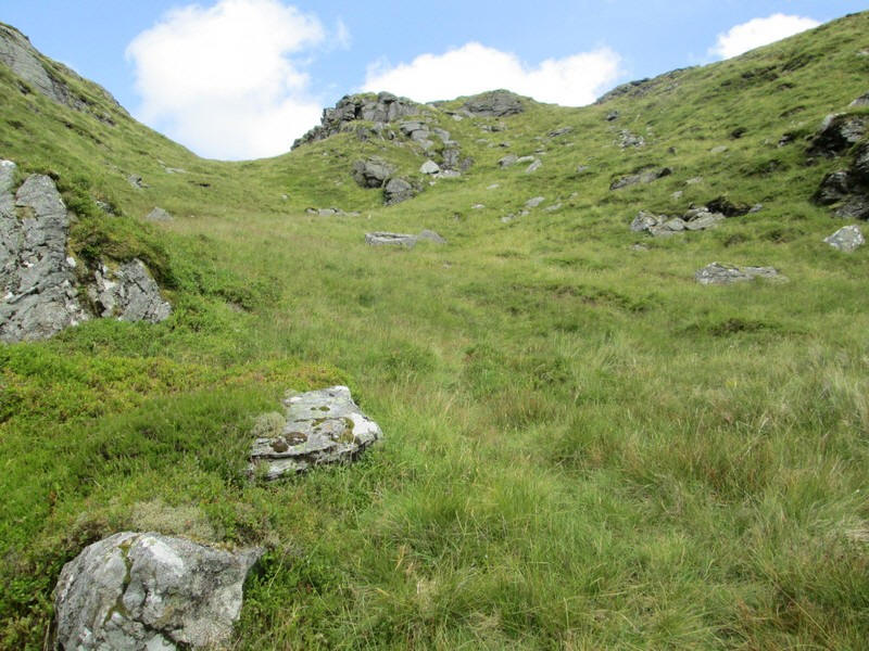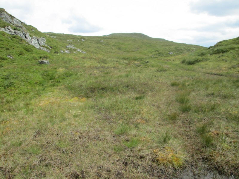 Looking down to the bealach with Cam Creag directly ahead and the summit of Meall an t-Seallaidh over to the left.