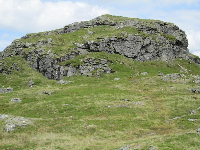 ...and then a rather formidable looking rock formation below the actual summit. Luckily there's a clear path up to the top traversing from bottom right to the left up a grassy rake..