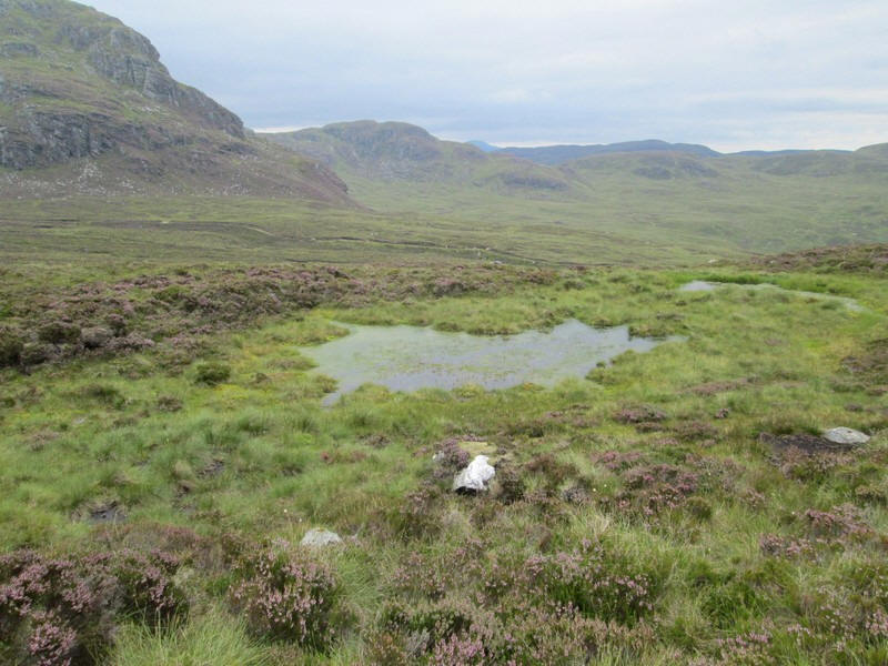 This partially dried up lochan was considerably smaller than shown on the OS maps and another sign of the dry weather .