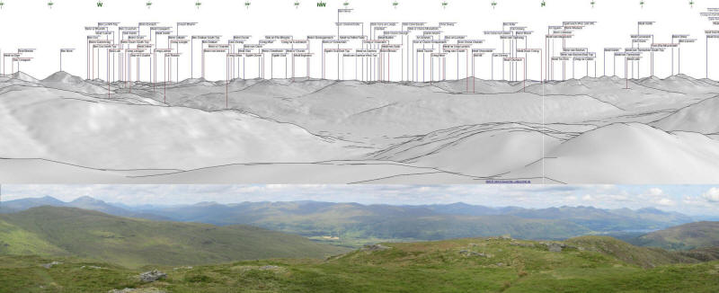 The view looking north from the summit with a panorama diagram shows the extent of the view from Ben More on the left across to Ben Lawers on the right. That is distance of about 20 miles between these two hills.