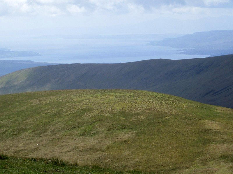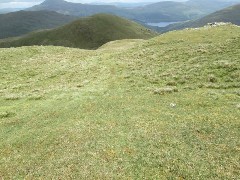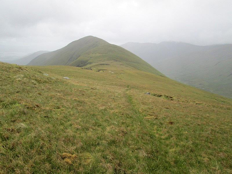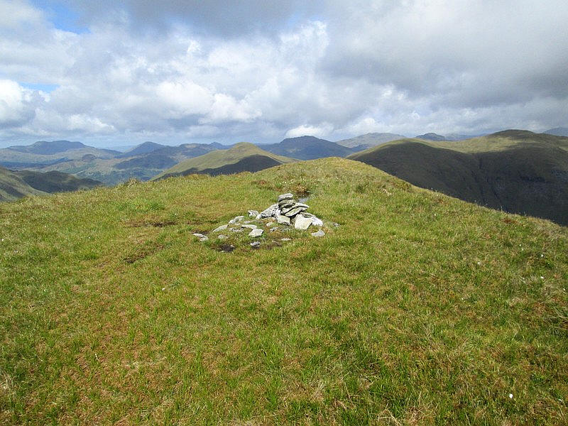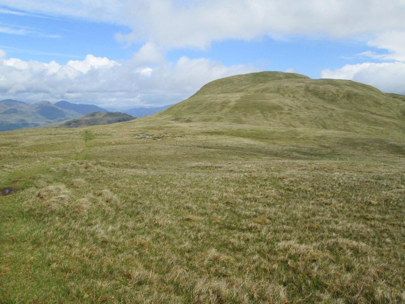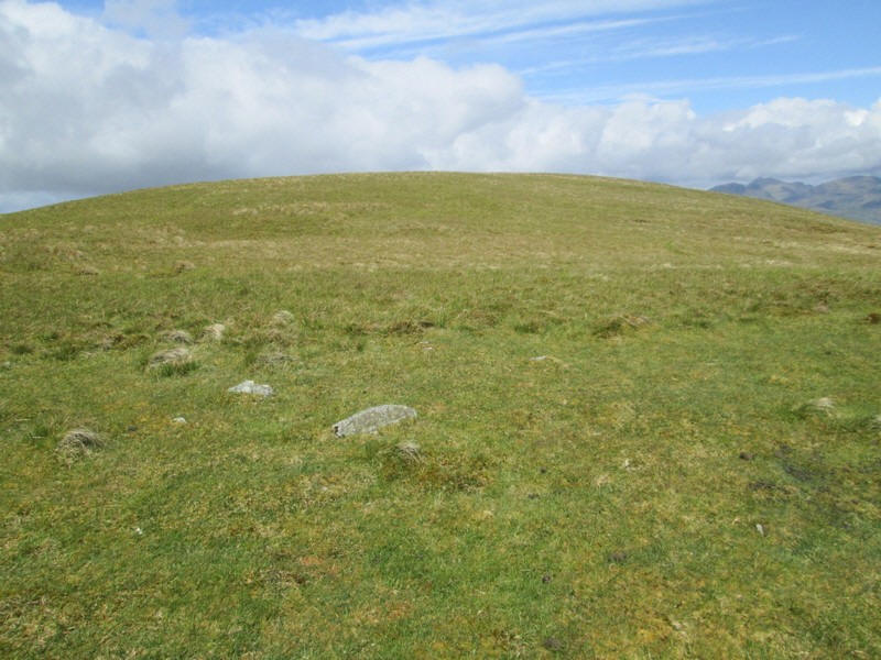 Ben Eich summit has a small pile of stones on the top. This is looking north west towards the summit of Doune Hill seen on the right..