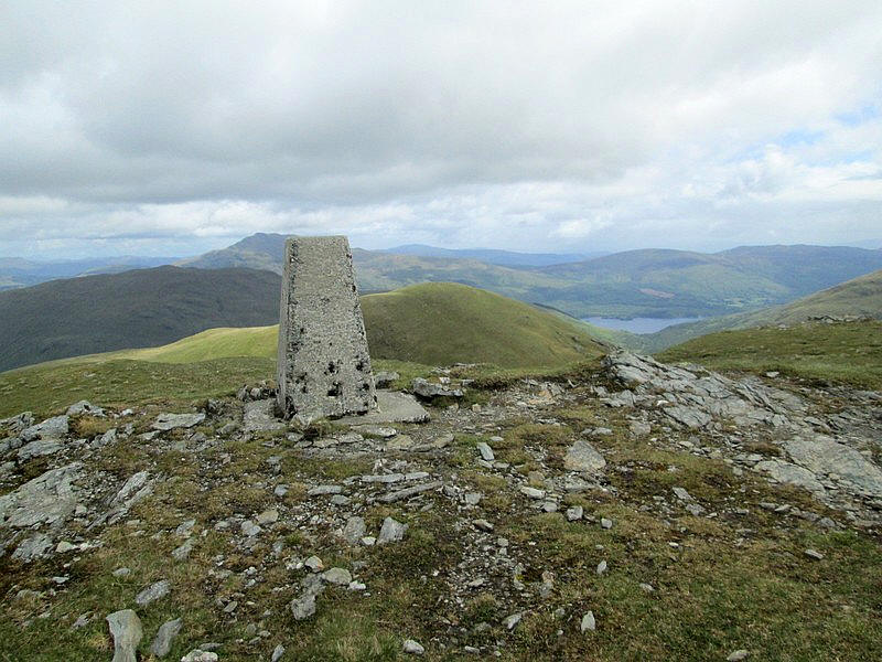 The trig point of Doune Hill with Loch Lomond and Ben Lomond just to the left of it. It had taken me four and a half hours to reach the summit, rather longer than expected because I had had to deal with two problems: a leaking sun-cream spray and a quite bad cut on my hand when I leant heavily on a plastic toggle!!
