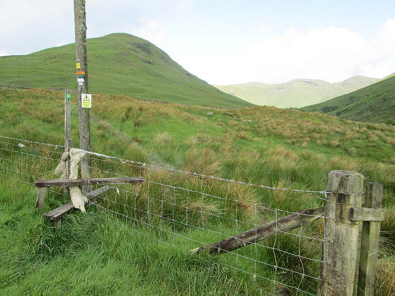 The lane climbs up towards Edentaggart where there is a stile with a sign point towards Beinn Eich.