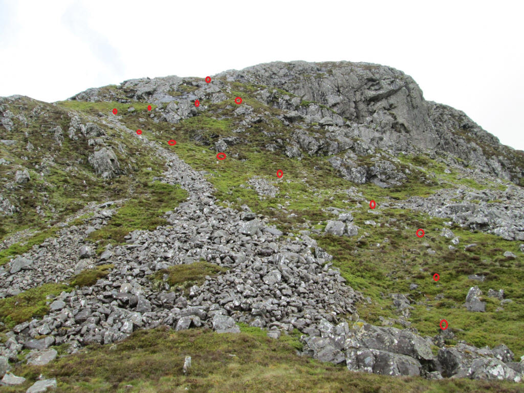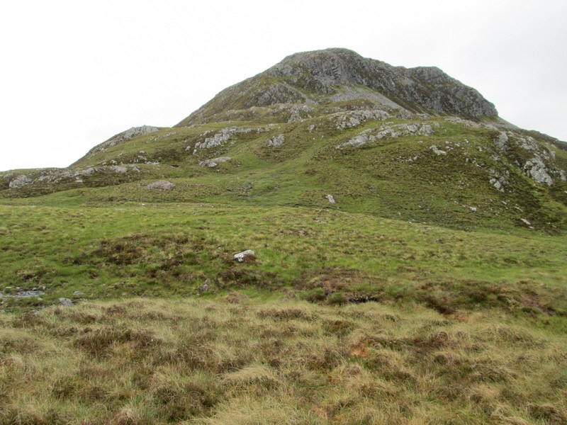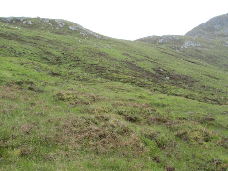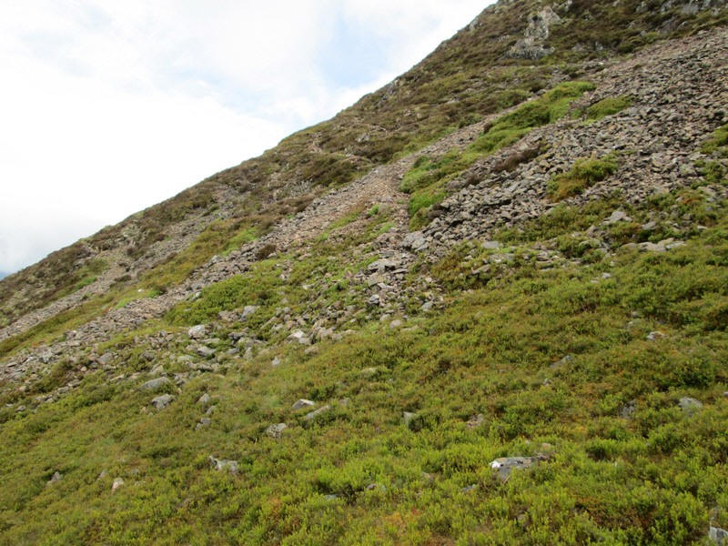The photo doesn't really convey the nature of the climb but it felt a little intimidating. It's roughly another 400 feet climb from this point. There isn't a clear track and the terrain is clearly very rough and steep with areas of boulders to cross. I think the way up will be on grass from the bottom right to top left and then cutting across to the right to reach the flatter summit area.