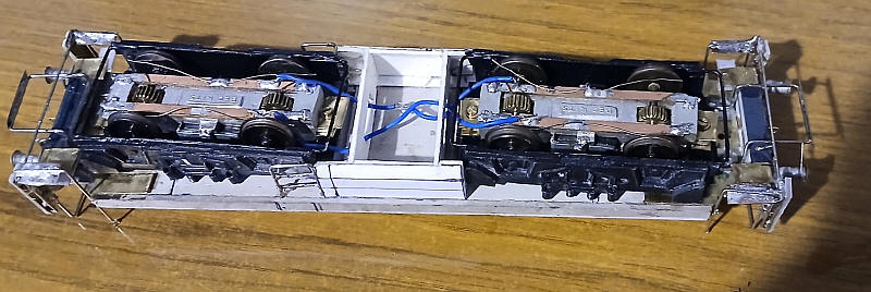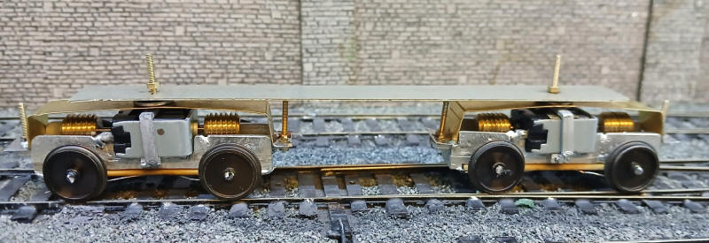 The bogies have now been sprayed and remounted onto the frame. I've also linked the two bogies together electrically so the model picks up current off all wheels.