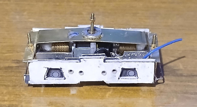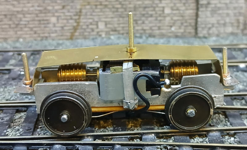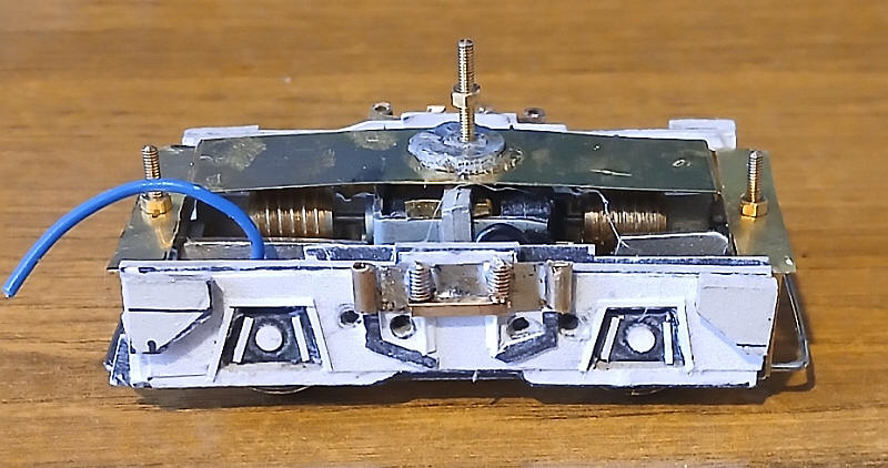 The two motor bogies have now been connected to form a working chassis. A length of nickel silver strip about 15mm has had holes drilled for the pivot points for the bogies. Two large washers were placed between the motor brackets and the nickel silver strip. This should give additional stability to the loco body and prevent it wobbling when the loco moves.