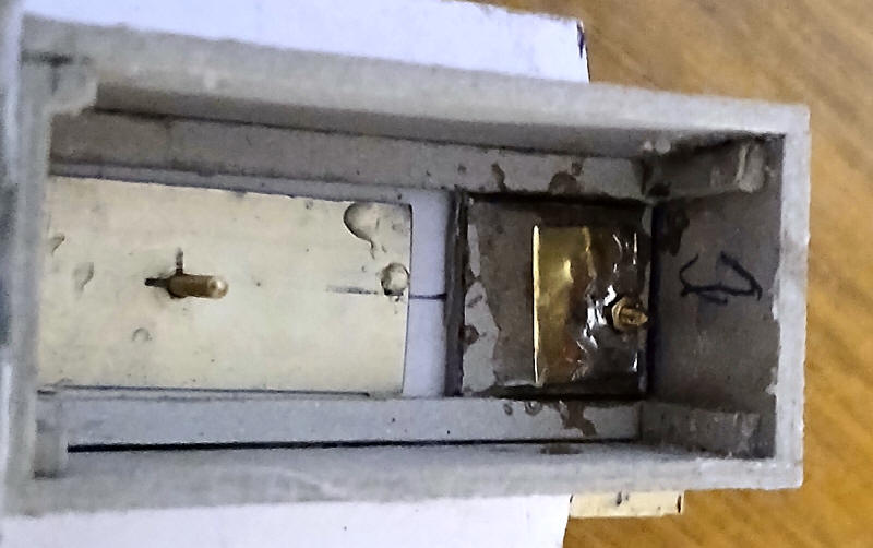 The photo above shows the simple bracket that I cut and folded from a strip of brass. The bracket is held in place with bolts passed through the securing lugs at each end of the white metal frames whilst the pivot point is another bolt located above the motor securing bracket.