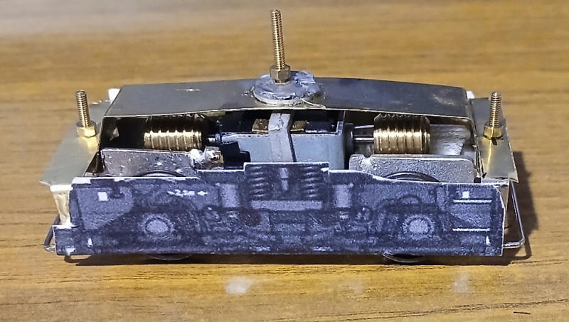 Having printed out the bogie side frames from the diagram at the top of this page they have been glued to the brass inner frames with epoxy. The height is easily adjusted by adding an extra nut as a spacer to the bolts before tightening the fixing nut in place.