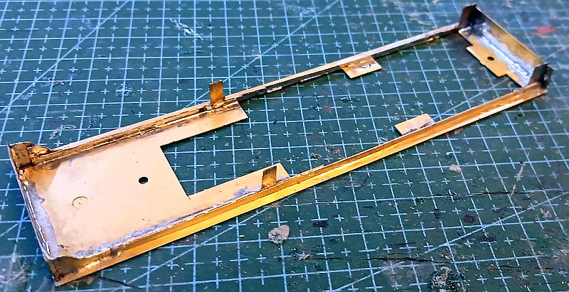 The next problem was that there were no nickel silver parts for the footplate valances. What I did have was a pair of valances for a Midland 2P 4-4-0 which, of course, have a raised centre section. I cut off the front and rear section of the valances and soldered them in place to the underside of the brass footplate. This gave me the support brackets for the four steps at the cab end and in the middle of the locomotive. I then soldered nickel silver strip along the underside of the footplate securing it to the two sections of the 2P valances. There was a short section at the front bufferbean where a piece of bass was cut to shape to form the curved section of the valance at that end. Finally the cab end drag bar and the front bufferbeam were soldered in place. To my surprise the frames fit exactly between the buffer bean and the drag bar.