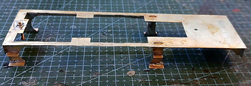 The frames have been assembled using the frame spacers included on the chassis etch. The bogie has been assembled as a rigid bogie rather than one where the frame sides can rock. This meant soldering the two parts for each bogie side together and then soldering washers on the top of the bearing holes.