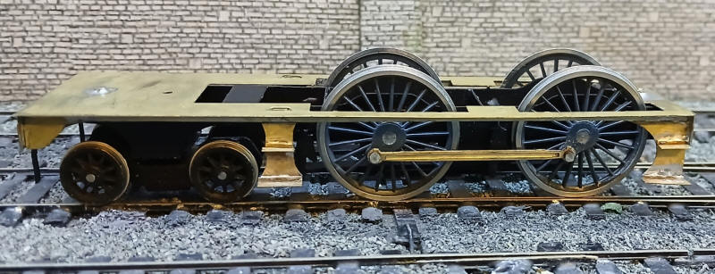 The chassis has had its brakes fitted and has been painted. The permament driving wheels have been fitted together with the coupling rods. The chassis rolls freely although one of the wheels has a slight wobble to it - I find Gibson wheels difficult to fit as they rely too much on getting the axle through the central hole absolutely square.