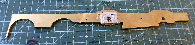 The first problem was that whilst most of the models had frames with just a small pilot hole for the driving axles the 700 frames were different. The front axle had a square hole which was intended to use a sprung hormblock. As I didn't want to introduce this level of complexity I decided to solder a nickel silver hornblock blanking plate and mount the top hat bearing in the hole in the plate. In order to get the axle holes in the correct place after soldering the plates into the frames I soldered the frames together ensuring that the pilot holes for the brake rods and rear axle were exactly aligned. Then the two top hat bearings were aligned with a spare axle rod and the bearings soldered in place.