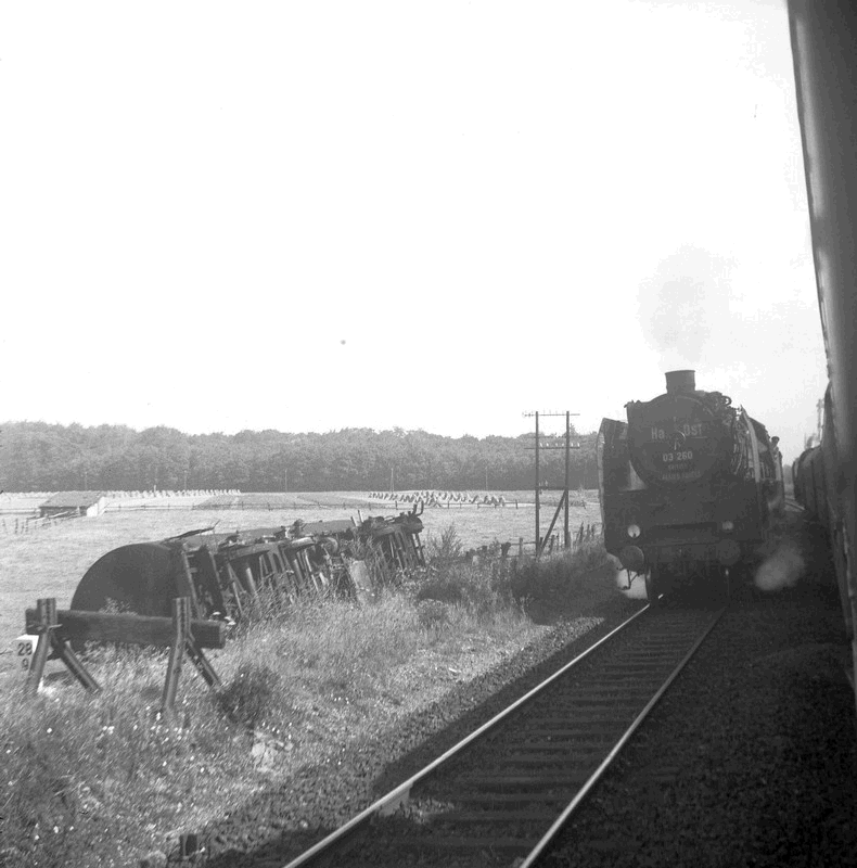 A westbound military train to Hook of Holland, behind 03.260, passes the Brussels to Hannover military service at Haste on 11th August 1946. Note the tanker wagon tipped down the embankment to clear the line.