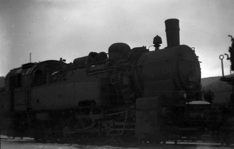 74.1067, a 2-6-0T, ran by on the roadside line (Altenhunden—Fredeburg; former KBS 239a and now closed). I got a lift for about thirteen miles in a 3-ton truck driven by a German. He was in the "Arbeitsdienst" (Labour Service), a British army unit of German P.O.W.s not yet released and usefully employed on general labouring duties. He was glad of company and very chatty. When I finally got back, I was pretty tired after a long trudge over lonely, snowy roads but very pleased with the day’s results. After this trip, I decided to go as regularly as possible on local journeys by lorry (or as happened, in the event, by local train) to sheds or on trackside observation when officially off-duty. The only snag was that every trip by lorry, or local train, to the nearest mainline at Nuttlar was about 24 Km.