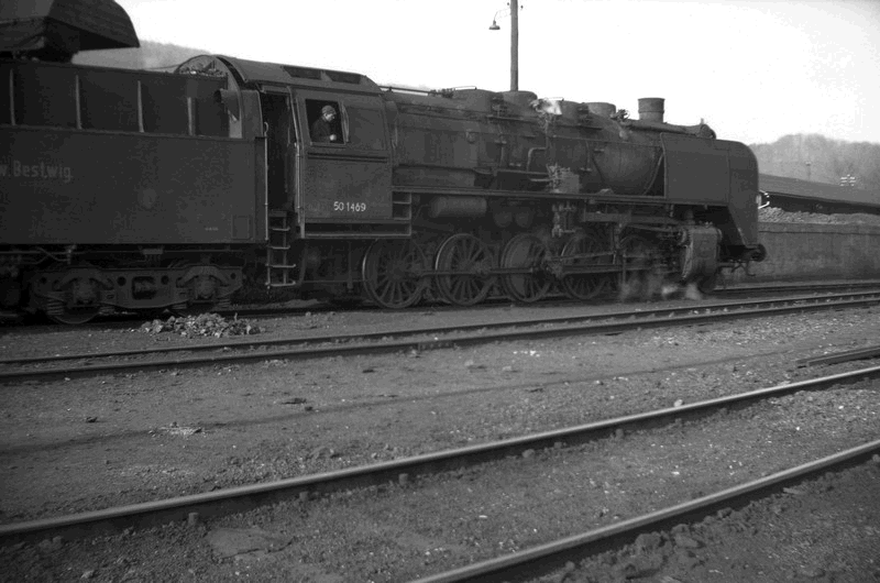 It was a bright spring day and I got a few snaps, including a very early BR 50; 50.025. There were BR 55s shunting, three BR 38s, all from Bw Hagen-Eckesey, but only two BR 44s. one being from Bw Vorhalle, a goods engine shed just north of Hagen on the Bochum line (KBS 330).