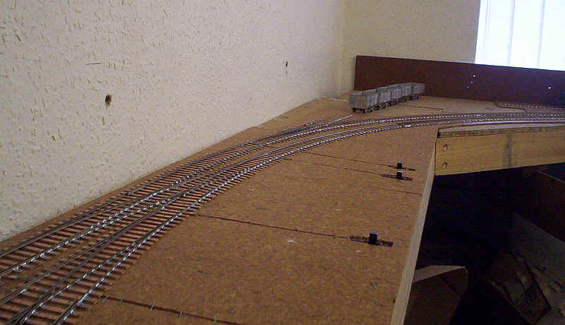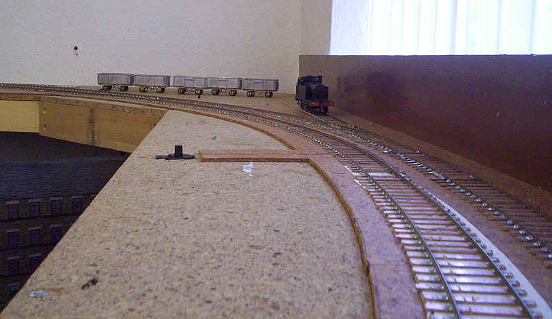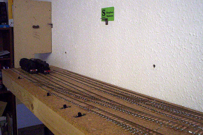 ...be seen in these two photos. These will eventually continue through the hole in the piece of timber seen at the end of the baseboard. The loco servicing area will have space for about seven locomotives when the track is finished.