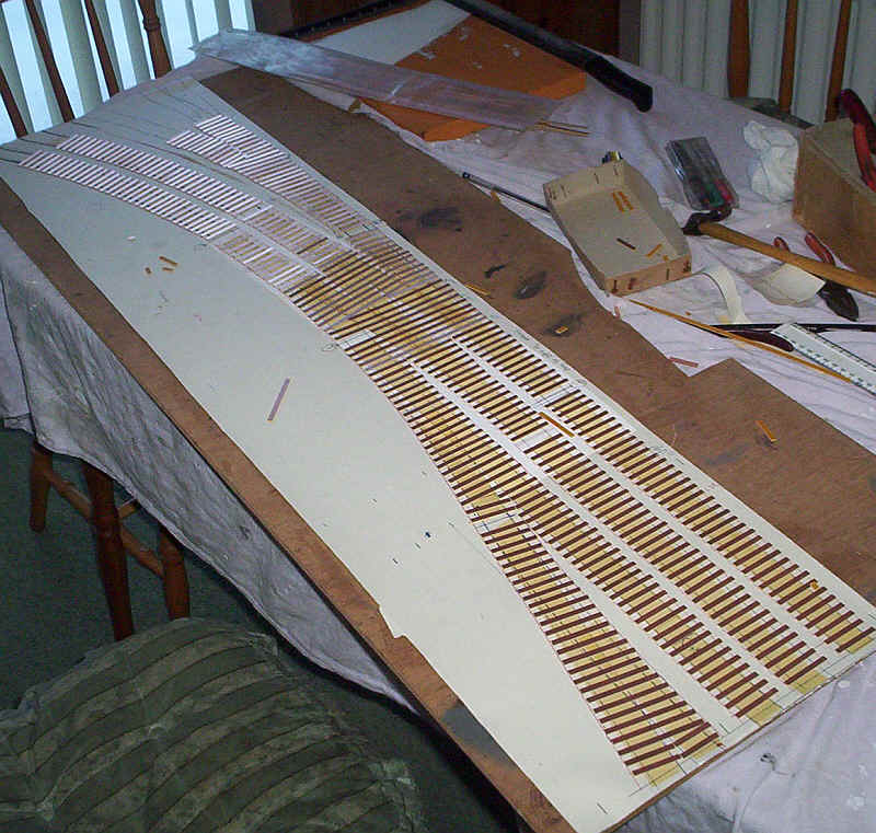 The track was glued in place using PVA adhesive spread sparingly along the back of the sleepers and then held in place with fine black pins. After the inevitable short circuits were sorted out the track appears to function well. Using the larger profile rail (code 95) certainly improves the appearance of the track, which looks less spidery than that on Halifax Midland.