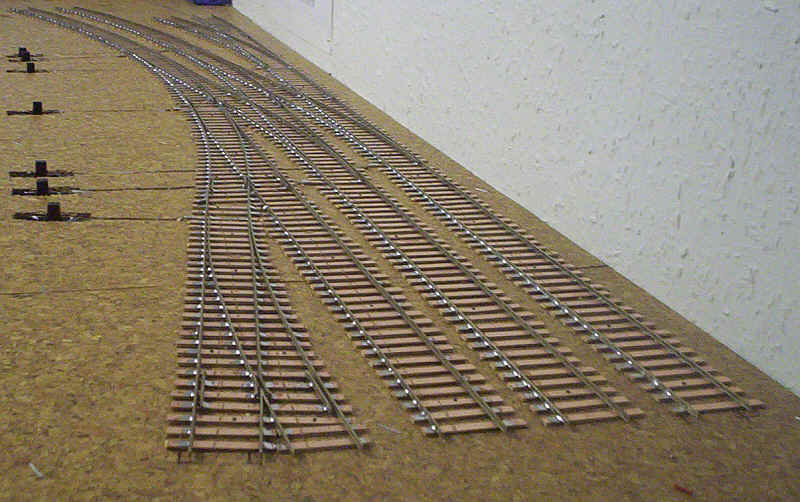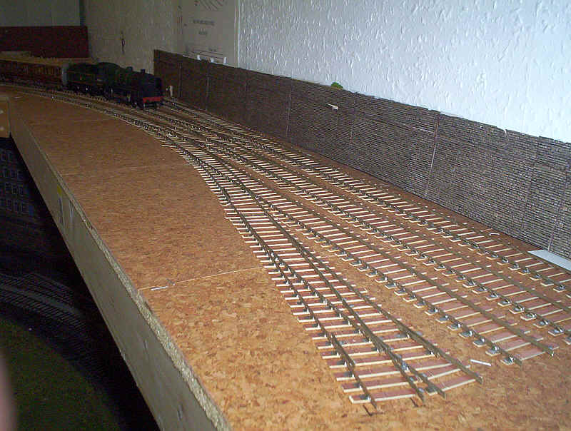 The five straight roads that form part of the carriage sidings/ sorting sidings are complete and wired up. I have to admit it looks quite good although, of course, I'd really like another 2 or 3 feet in length...... behind the camera the double track is already laid curving around the end of the layout. It's even possible to start running trains.