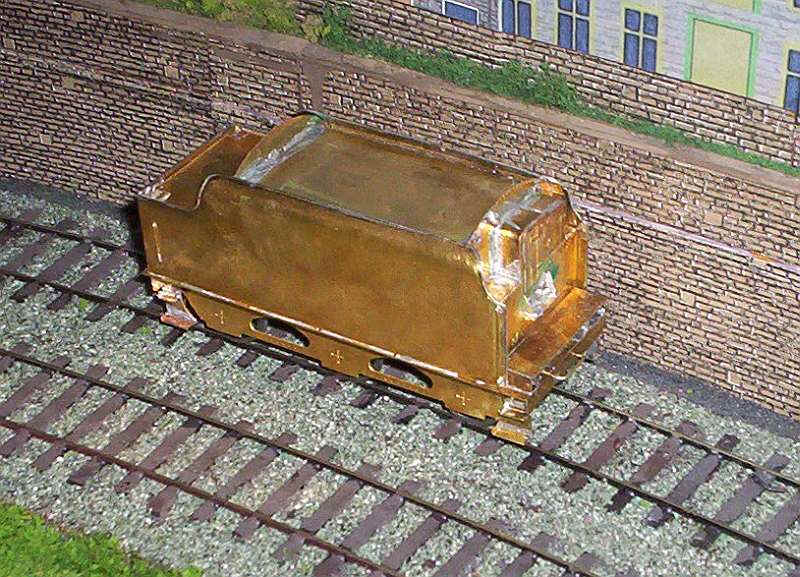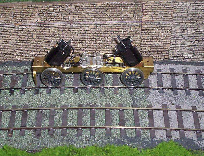 Below is a photo of the basic Stanier tender body mounted on the chassis. What the photo doesn't show is that the body is heavily weighted with sheet lead, so that the tender will pull at least nine coaches and propel a loco. The only slight compromise is that the coal space is flat to accommodate the motor shafts which stick up in the air.