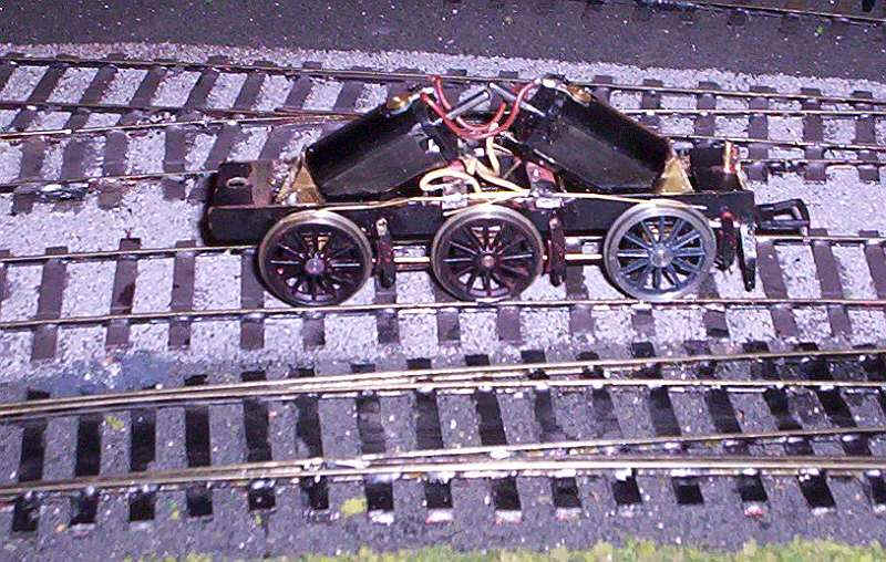 The rest of the construction involved fitting tender pickups; a couple of printed circuit board strips glued onto the centre spacer and some nickel silver pick-up wires bearing down on the treads of the wheels were soldered in place. Since the photo was taken I've added them to the free rolling centre axle.