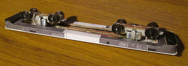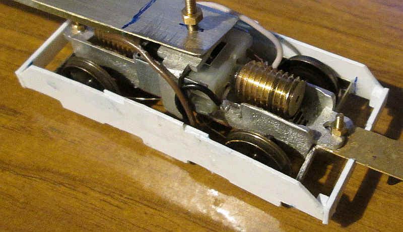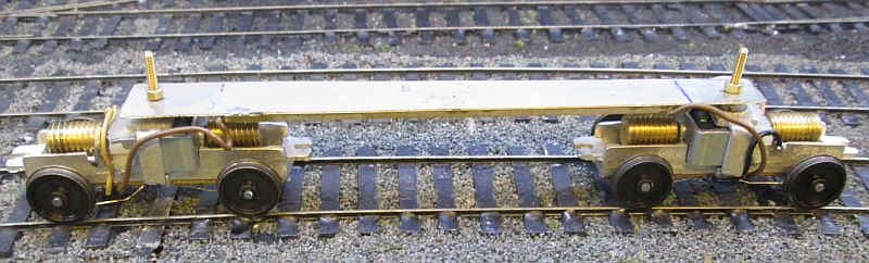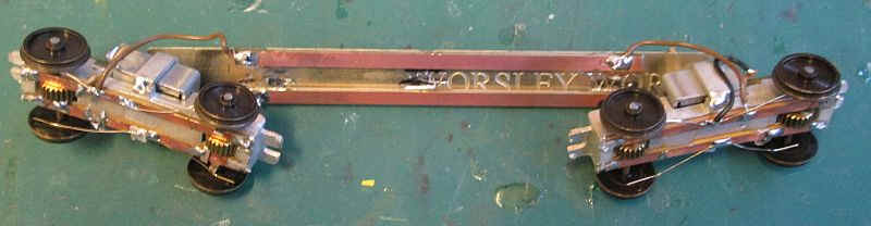 To strengthen the spine I soldered some double sided sleeper strip to the underside. These are also used to transfer power between the motor bogies giving eight wheel pick up. After a short running in period the chassis works smoothly with excellent slow running.