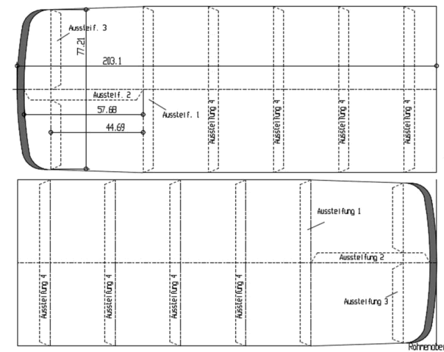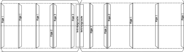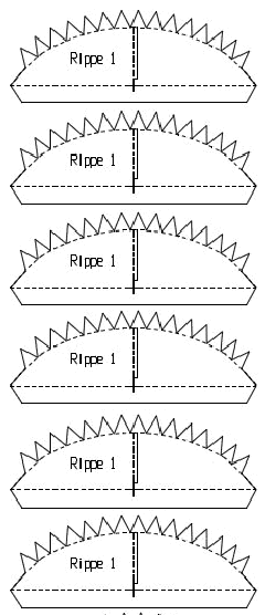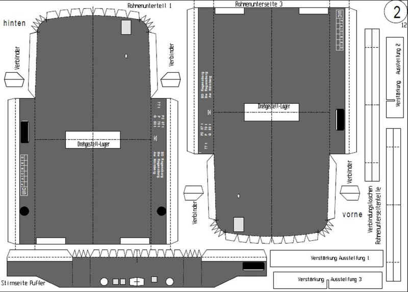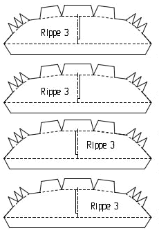 The first step was to cut a piece of card to the shape of the top of the body. This would overlap the sides and ends by about half a millimetre and would represent the prominent rainstrip that runs around the base of the roof. The kit includes a base for the ribs which will support the roof. These two parts are joined together and the tabs along the long side folded inwards. These will be used to fix the curved roof panels in place. The roof support ribs (Rippe) come in three varieties. Rippe 1 is for the main roof sections Rippe 2 is for the ends of the lowered roof section in the middle Rippe 3 is for the lowered roof section in the middle The small tabs on the curved section of the roofs were removed whilst the tabs at the base were folded over.