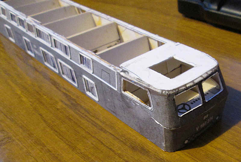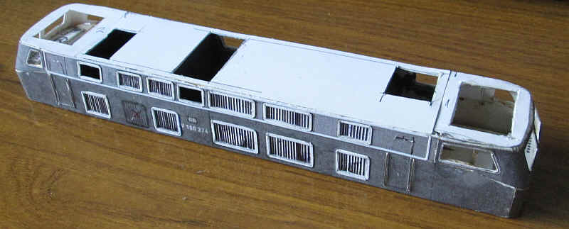 The door openings have been scribed with a craft knife and the cab handrails from nickel silver wire have been added. The sections of the body with window openings have been painted a dark grey. Finally the false roof with openings to allow the addition of the glazing after painting has been glued to the top of the body sides.