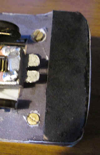 The body is fastened to the chassis with six 8BA bolts. The nuts are held captive with small pieces of thick cardboard with slots that prevent the nuts rotating or moving vertically. There are two fixing points in the centre of the loco's body and two under the cab floors.