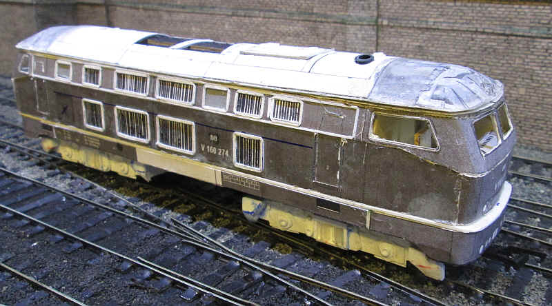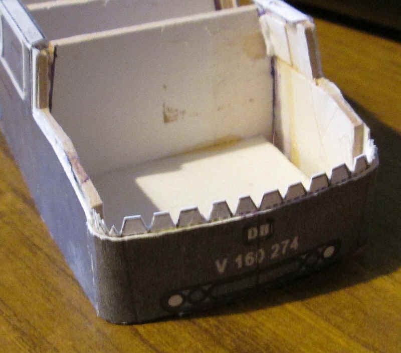 There are also some small ribs for the domed section of roof over the cabs. These have interlocking slots which need to be cut out. The photo above shows the assembled roof sub structure parts in place. Also visible at the far end are the first of the pieces of thick card which will be built up in layers to form a rigid sub structure onto which will be glued the various layers of the roof covering. Constructing the domed end of the roof was something that has concerned me but in the end the method I used was remarkably simple. The photo above shows the completed roof end. How did this is described below. 4 The gaps between the ribs at the end of the roof were filled in with stepped layers of thick card tapered to a point at their out edges by filing the card. The two pieces for the domed end on the pdfs were printed out on printer copy paper and cut out. There are two parts for the cab roof and I stuck these in place separately beginning with the "rectangular one" at the top of this image. Then the stepped layers of card were covered with a thick layer of two part epoxy and the underside of the paper was also coat in epoxy. Then the paper was laid on top of the ribs and held in places until the epoxy started to harden. Once this had completely hardened the curved part for the cab front was also glued in place again using large amounts of epoxy. Note that there was no need for the V slots to be cut as the paper will become slightly damp with the epoxy and stretches and easily adapts to a natural curved shape. The resulting roof is extremely strong as the epoxy sets and forms a solid base under the paper. In addition the top surface of the paper will have a thin film of epoxy on it from the carry over from the edges on your fingers! The first section of the main roof is now in place. After building the stepped card fillers between the ribs epoxy was applied to these and to the underside of the card roof section. This had been preformed to the correct curvature using screwdriver handles, paint brushes and fingers. The next part to go onto the roof is the printed grills that are above the main engine compartment. The lines were scored heavily with a biro before the rectangle was bent along the dashed lines and glued in place with a thick layer of epoxy resin. This photo unfortunately brought home to me that there was also a small but noticeable fault in the body shape. The top part of the body side should slope in more than it does. What this meant was that I was going to have to very carefully remove all the internal partitions and the internal false roof. The use of a new knife blade and pliers to bend and remove the old partitions soon completed the destructive work with no disastrous results. New partitions were cut with much sharper angles on them and fastened in place. The body sides were obviously slightly weakened by this but several layers of card inside the body shell soon sorted out this problem and within a couple of hours the loco looked much more like the real V160 with its characteristic inward slope to the body. The roof also had to be slightly narrowed to fit the revised body shell. Fortunately, I was simply able to file away the rather exaggerated rain strips on the edges of the roof which brought the roof down to about the correct width. The roof has also had a great deal of work done on it with plastic tubing inserted into the card roof to form the various exhaust outlets. The heads of small Lil dressmakers pins have been used to represent the lifting rings for the roof sections. The roof has now been coated with some Ronseal wet roof wood hardener liquid which makes the card really tough. I used this on my V100 with good results so I decided to repeat the progress on the V160.