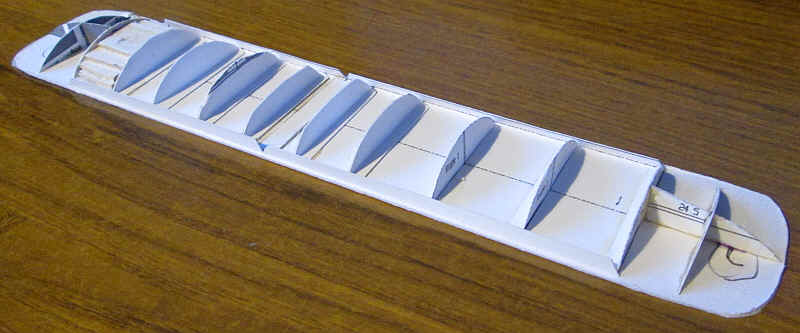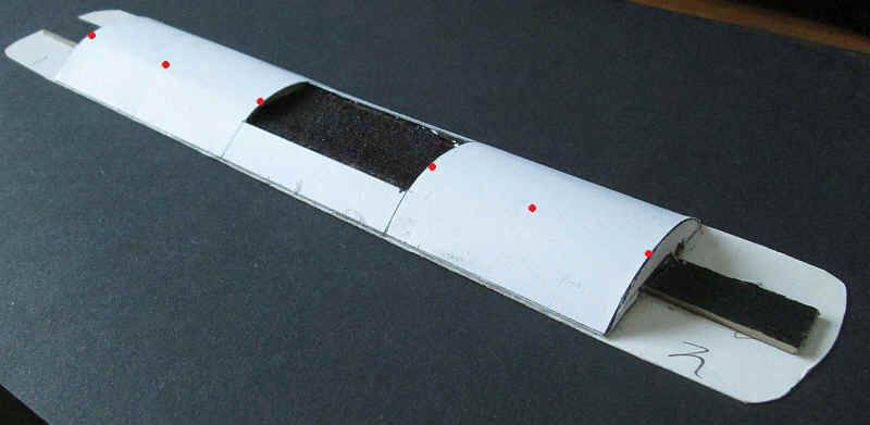 Six roof ribs were cut from the pdf kit but reduced slightly in height by about half a millimetre. These were then glued on to the thick card and cut out. A slot was cut in the base of each rib to allow them to fit over the longitudinal spine and then these were glued in place at the points marked with red dots.