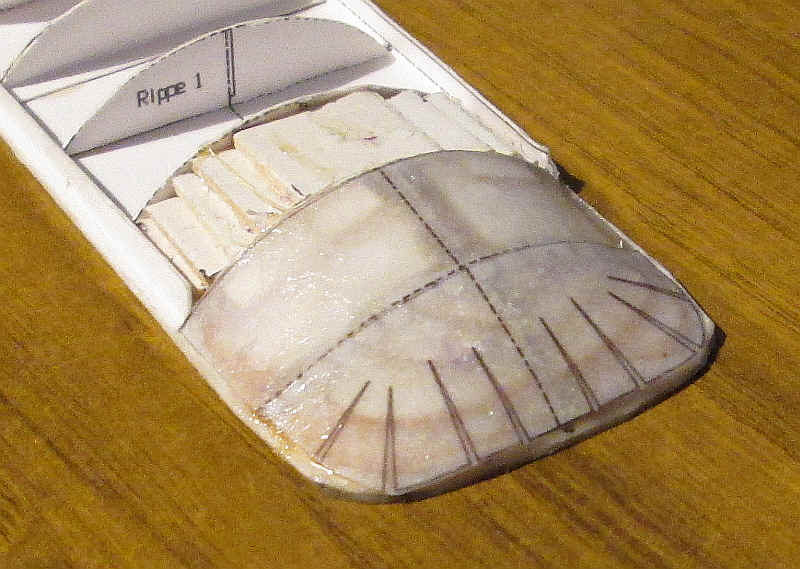Although I'd wasted a lot of time building the first roof most of the methods I used were repeated. The problem seems to have been that I hadn't made the necessary allowance for two things. Firstly, the base of the roof was too thick whilst the roof ribs (Rippe) when folded were lifted up by the thickness of the card tabs.