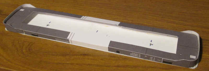 The next stage is to cut another piece of card that will be glued inside the outer side. This also has to be creased and folded inwards at the same place as that of the lower edge of the trim. The positions of the grills were marked and a biro was used to heavily score the card in the correct places to represent the vertical slats of the grills. Openings for the window glazing were also cut out of the backing card