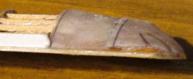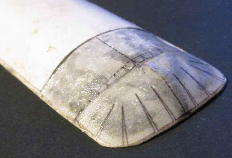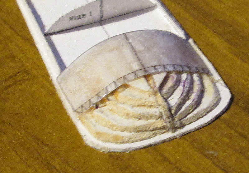 ...and then the two pieces of paper printed out from the pdf were stuck in place. The first one to go down is the one next to the main roof and after that the curved front pieces is added. The joints between the various pieces of paper and card have been filled with epoxy and then filed smooth to give a flush surface.