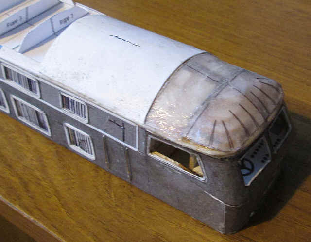 I felt that the least satisfactory part of the pdf kit was the roof. Photos of models built as intended showed a rather crude appearance with gaps and overlapping parts detracting from the final result. I decided that the roof would need to be constructed as separate part to the main body shell and that it would have to be much more substantial and where necessary the card would be filed to shape and any gaps filled with epoxy or other filler.