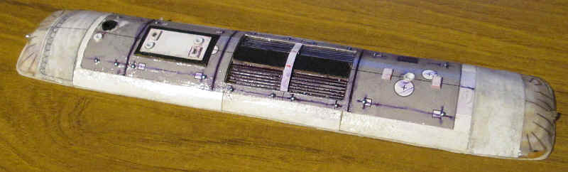 The spaces between the ribs were filled with layers of card gradually reduce in width towards the top of the roof structure, as I had done on the original roof. In the centre a new radiator panel was made as in the original roof. This time I decided to make the main section of the roof as one piece with the centre section cut out for the radiator grill section. After curving gently to shape the whole of the underside of this card was coated in epoxy resin, as were the layers of card. The roof was then placed in position and held in place with a few clothes pegs along the edges until the epoxy began to cure. Gentle finger pressure was then used until the roof was firmly held in place.