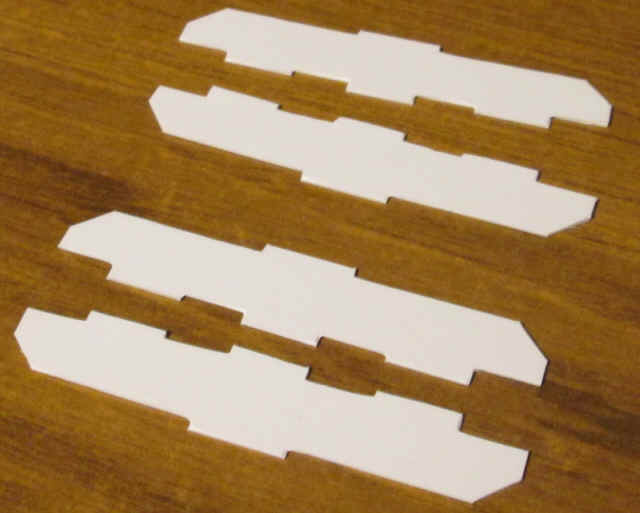 These card parts have been modified slightly with the tabs folded over at the bottom of the white stripe rather than at the top. This is because they are then glued onto the 40 thou plastic.
